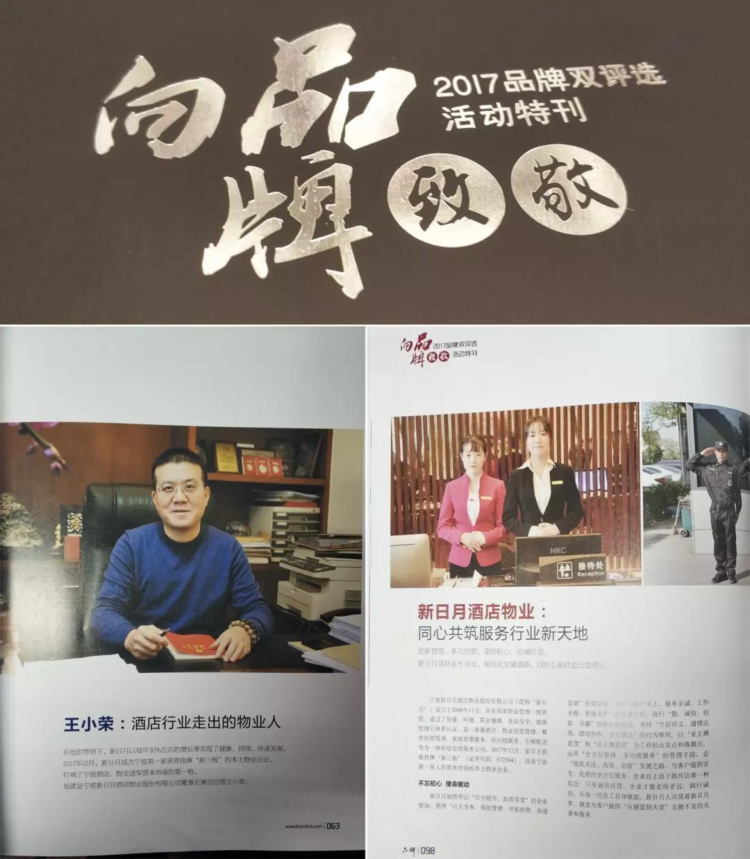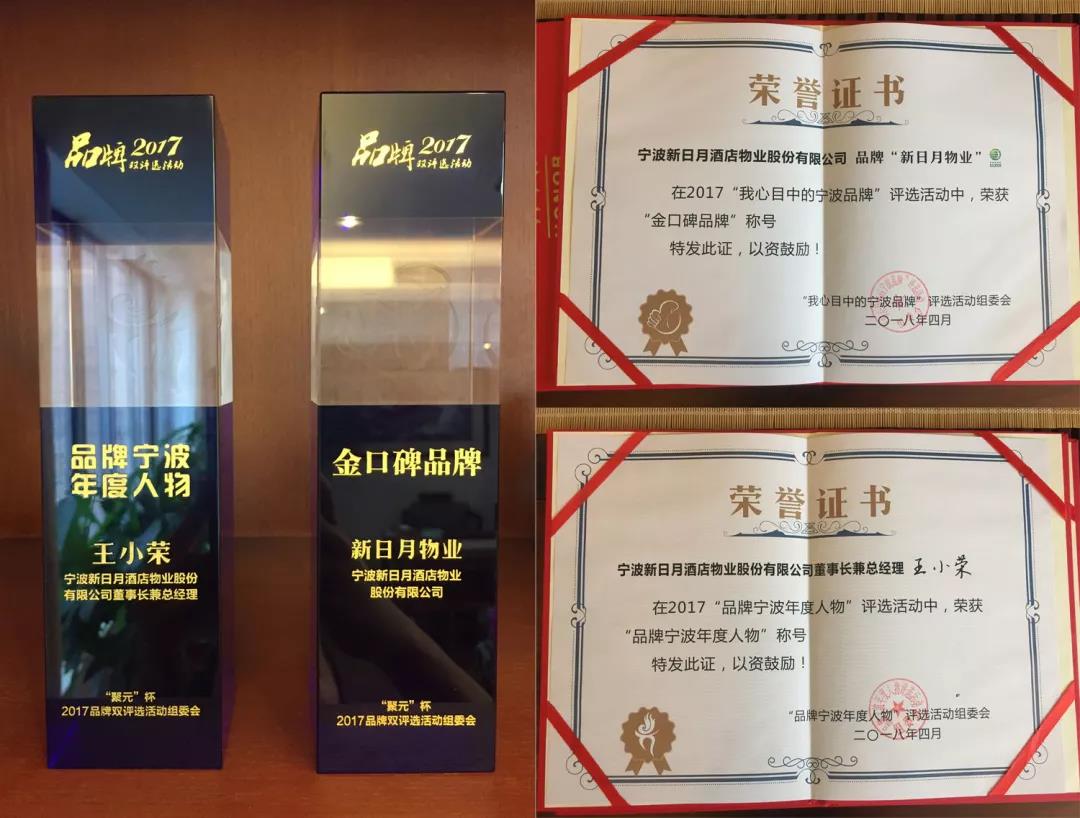 4月13日下午,2017年宁波品牌双评选颁奖典礼在宁波南苑饭店隆重举行,宁波市人大常委会副主任王建康先生、宁波市政协副主席张明华先生、宁波市政府副秘书长胡望荣先生等多位政府领导以及来自宁波各地七百多位企业家、品牌人、媒体人等组织机构代表出席了颁奖盛典。我公司品牌“新日月物业”再次荣膺宁波品牌最高奖项——“金口碑品牌”称号,董事长兼总经理王小荣获“品牌宁波年度人物”称号。