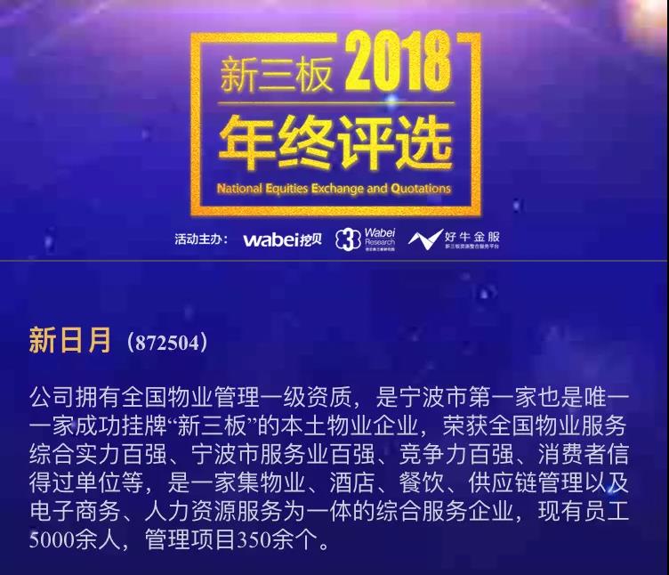 新日月拥有全国物业管理一级资质,是宁波市第一家也是唯一一家成功挂牌“新三板”的本土物业企业,荣获全国物业服务综合实力百强、宁波市服务业百强、竞争力百强、消费者信得过单位等,是一家集物业、酒店、餐饮、供应链管理以及电子商务、家政育婴服务等为一体的综合服务企业。