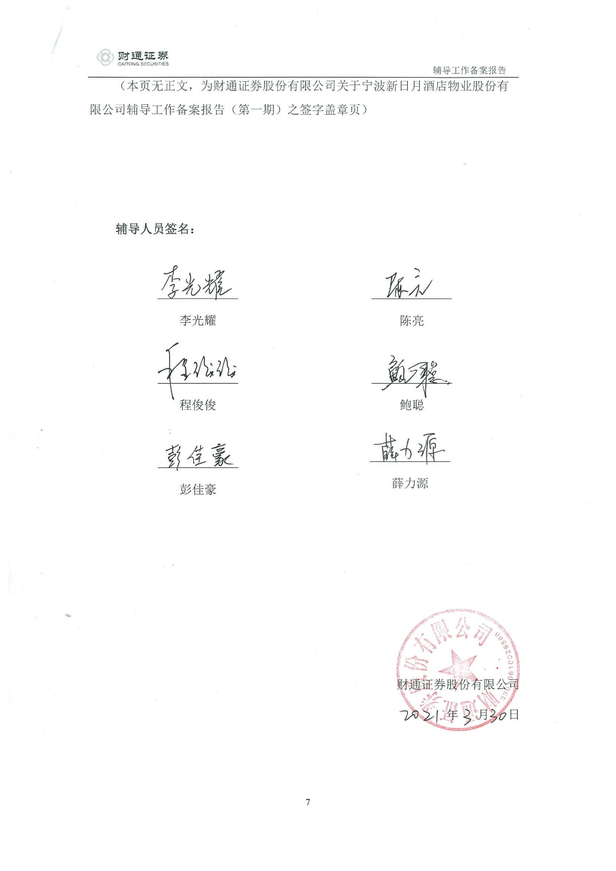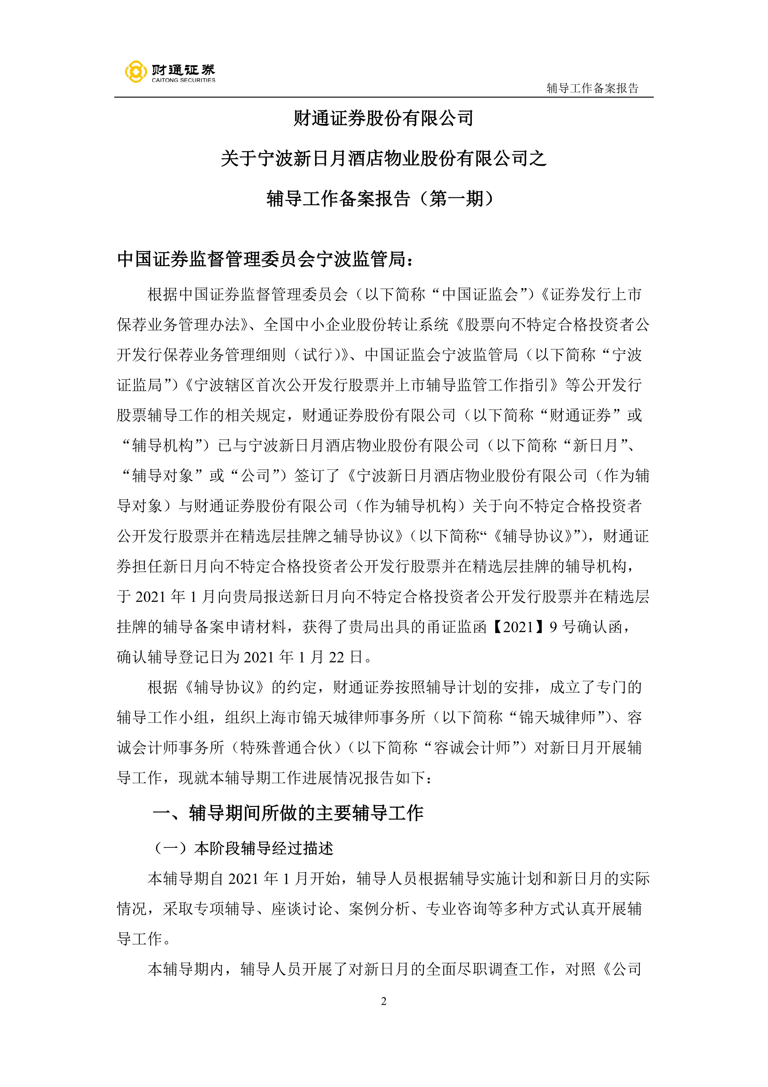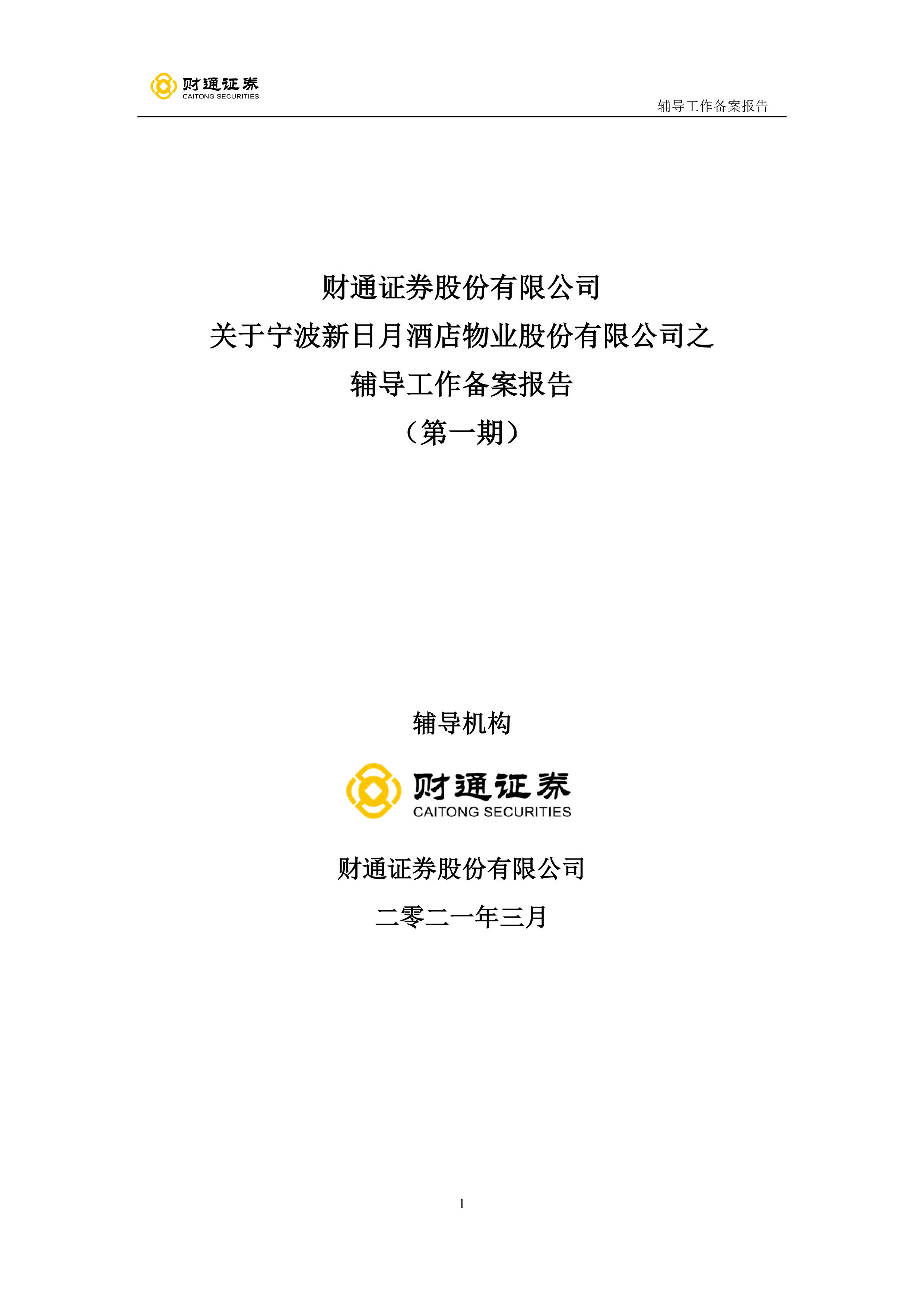 财通证券股份有限公司关于宁波新日月酒店物业股份有限公司之辅导工作备案报告(第一期)